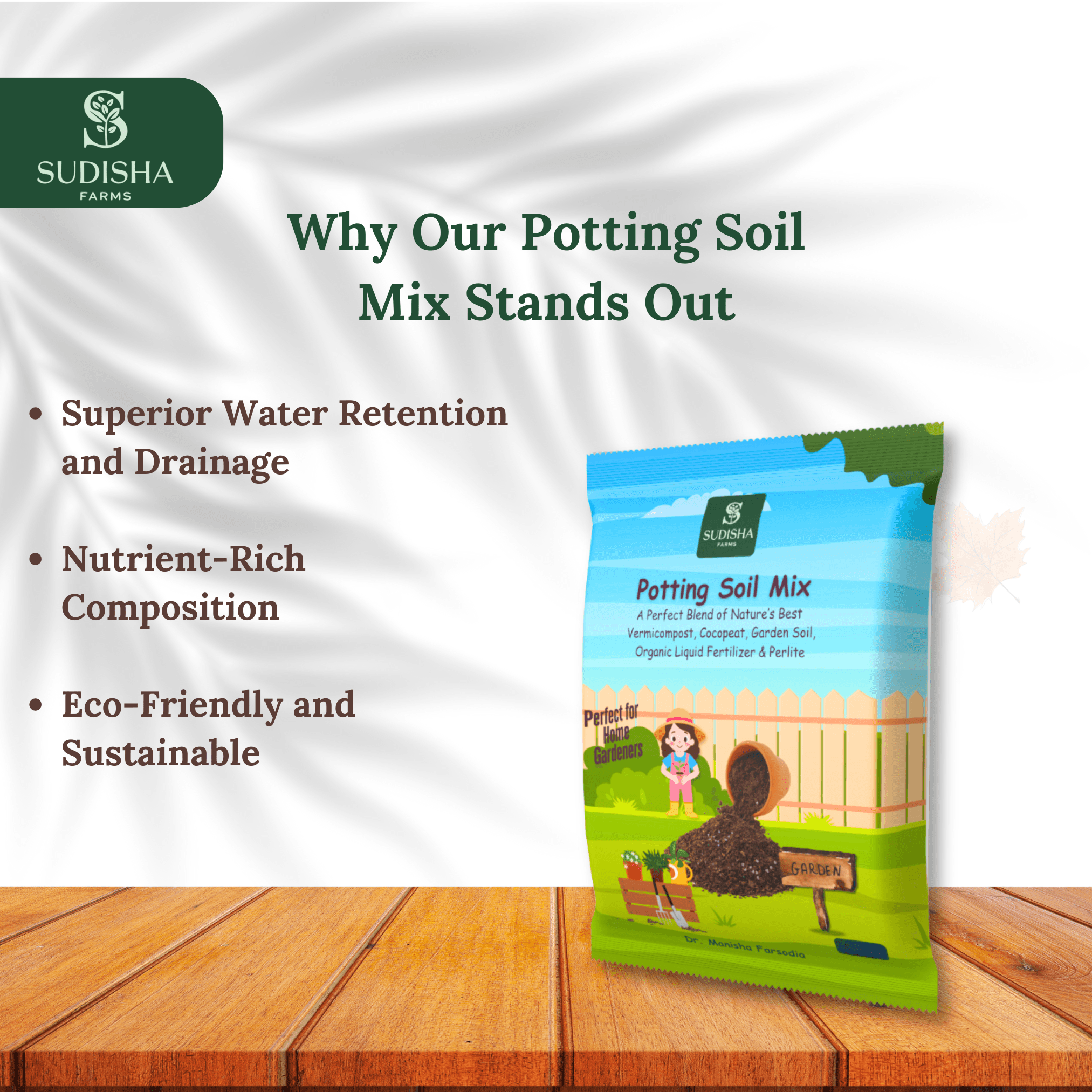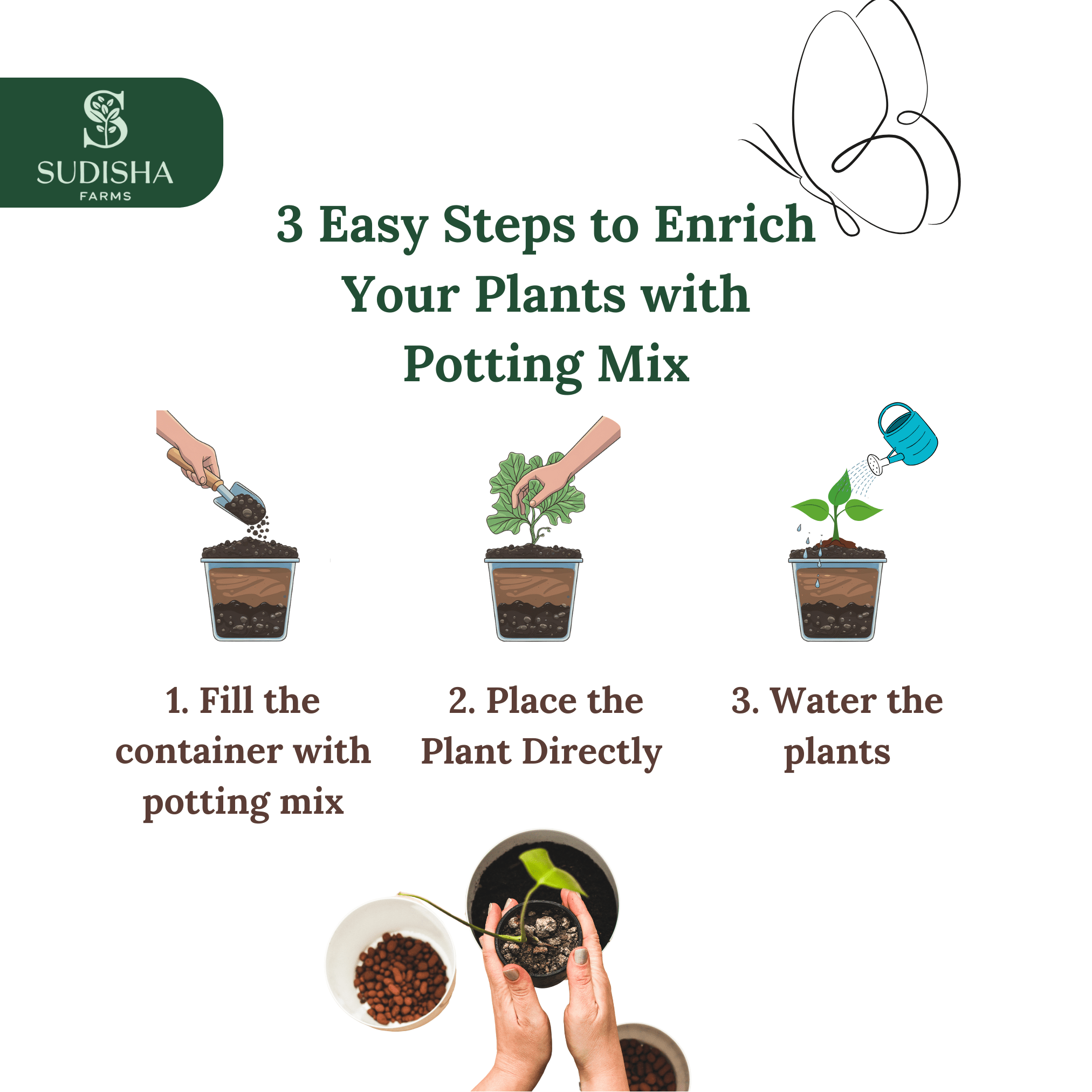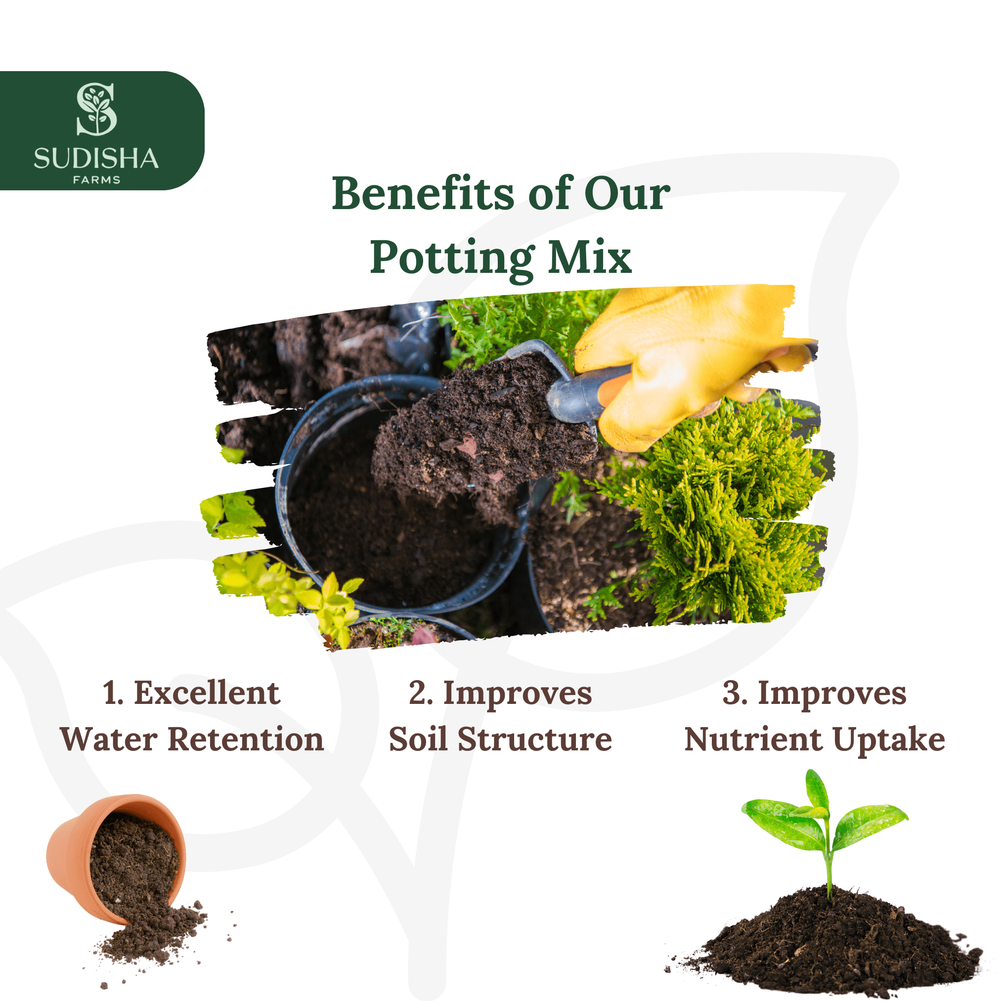 Give your plants the healthiest start with Sudisha Farms Premium Potting Soil Mix – a scientifically blended, nutrient-rich growing medium designed for indoor and outdoor plants, kitchen gardens, terraces, and balconies. Our potting soil contains a balanced mix of organic compost, cocopeat, vermicompost, and natural minerals, ensuring excellent aeration, water retention, and root development.